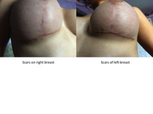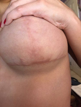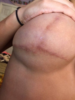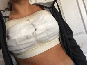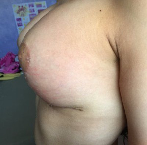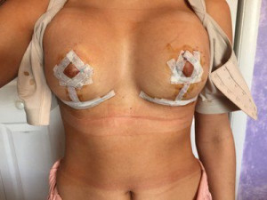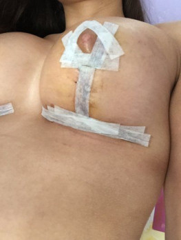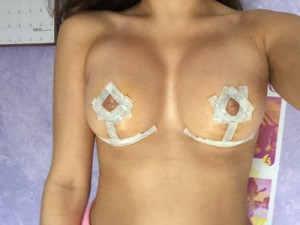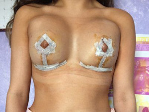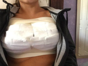 Ngực trái của mình có một số chỗ bị phát ban, ngực phải thì vết phồng rộp vẫn đang lành lại, không có biểu hiện nào quá tệ, chỉ ngứa chút thôi. Mấy dải băng dính phẫu thuật steri-strip đôi khi cũng làm mình ngứa nhưng người ta bảo sau khoảng 3 – 6 tuần chúng sẽ rơi ra. Của mình chúng vẫn dính rất chắc, như keo ấy. Bây giờ mình cũng có thể tự lái xe được mà không hề bị đau. Nhìn chung mình thích vẻ ngoài của chúng và thực sự hi vọng cuối cùng sẽ có được khe ngực như hiện tại và ít nhất ngực vẫn giữ được dáng cao cao như này.