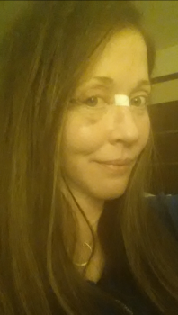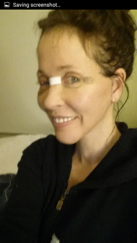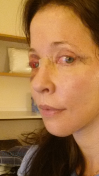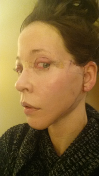 Mình vừa mới được gỡ nốt băng dán ở dưới cằm và trước dái tai. Mấy vết bầm tím đã đỡ rất nhiều rồi. Nhưng mắt thì vẫn rất khô, vì mí mắt sưng nên cảm giác không đóng kín lại được ấy. Vết mổ ở bên cạnh mắt lành lại nhanh lắm. Chỗ sưng ở thái dương cũng xẹp đi nhiều rồi. Tuy nhiên vẫn còn cảm giác nhạy cảm và căng ở dưới cằm với trên cổ. Mỗi lần hắt xì hoặc di chuyển cổ là lại thấy hơi nhức. Nhưng mà khô mắt vẫn là vấn đề khó chịu nhất.