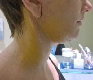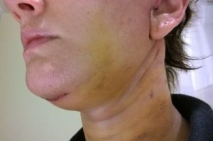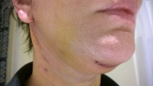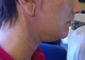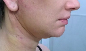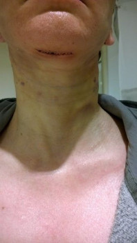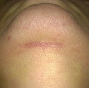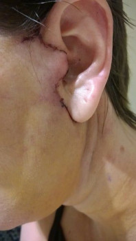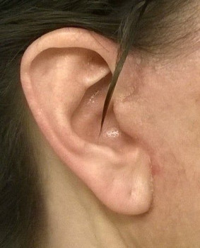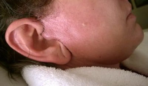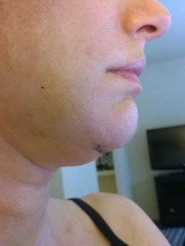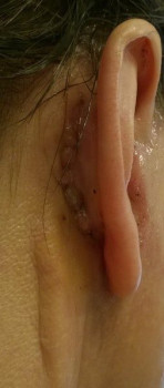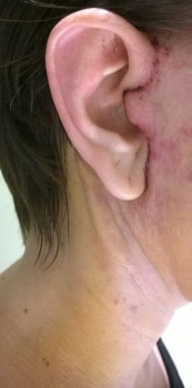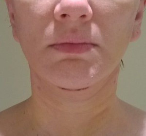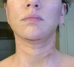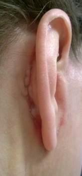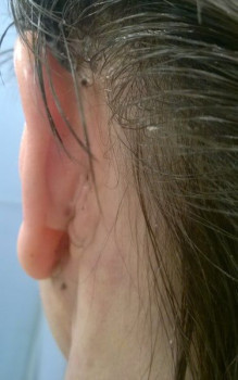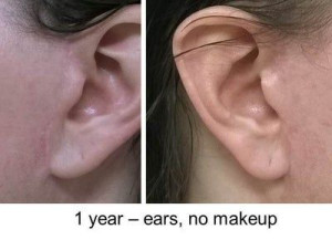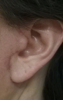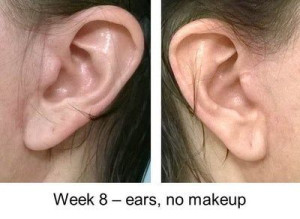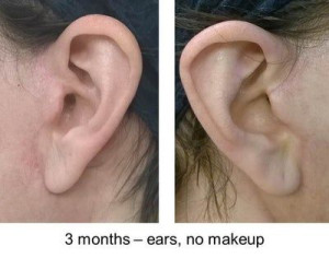 Vết sẹo đằng trước tai phải đã gần như biến mất nhưng bên trái thì vẫn chưa, mà tôi cảm giác nhìn ngoài vết sẹo còn rõ hơn cả trên ảnh ấy. Nhưng mà cũng may là có tóc che đi. Vết sẹo dưới cằm cũng vẫn còn rõ nhưng mà làm gì có ai nhìn thấy ở chỗ đấy đâu. Vì ánh nắng sẽ làm cho sẹo bị thâm nên tôi luôn chú ý bôi kem chống nắng và đội mũ rộng vành để sẹo lành lại mờ nhất có thể mà không bị thâm. Bác sĩ bảo là sau 3 tuần thì có thể đeo khuyên tai lại được rồi nhưng mà tôi mới chỉ đeo khuyên nhỏ thôi đã.
