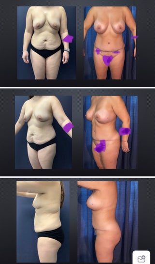 Kết quả của bạn thực sự là khá tốt. Tôi có thể thấy chỗ mà bạn có thể muốn tăng cảm giác đầy đặn ở cực trên, nhưng muốn thế thì bạn phải làm treo ngực sa trễ bằng đường rạch kẹo mút. Sử dụng các túi độn ngực lớn hơn không phải là một lựa chọn tốt, vì cuối cùng trọng lượng có thể kéo giãn vùng da ở cực dưới ngực. Vết sẹo phẫu thuật tạo hình bụng có vẻ vẫn bình thường, và thật may là bác sĩ của bạn đang điều trị sẹo tai chó.