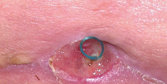 Đây có thể là tình trạng vết thương chậm lành do chỉ khâu bị đùn ra. Vui lòng liên hệ với bác sĩ phẫu thuật thẩm mỹ của bạn để được hướng dẫn chăm sóc vết thương tại chỗ. Có thể nên bổ sung cắt bỏ mô hoại tử.