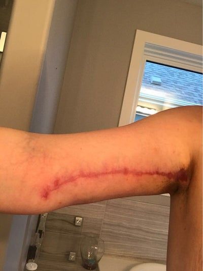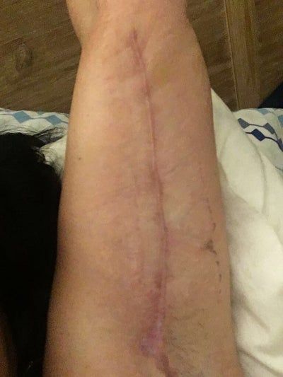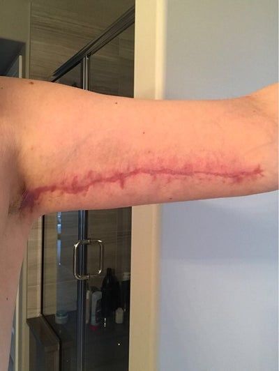 Vết sẹo bị đỏ và rộng sau căng da cánh tay