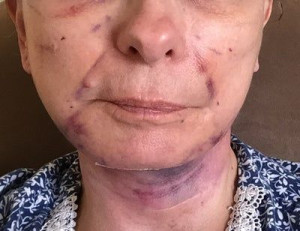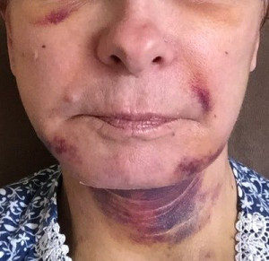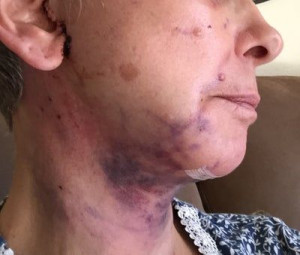 Đây là mấy tấm ảnh tôi chụp từ ngày hôm qua để mọi người thấy sự thay đổi ở mấy chỗ bầm tím và sưng. Bây giờ đã đỡ sưng hơn nhiều rồi nhưng vẫn còn bị sưng, đặc biệt là ở mặt bên trái. Mấy vết bầm tím đã di chuyển xuống ngực và những chỗ mà trước đây có màu vàng ở đằng trước tai giờ lại chuyển màu tím đen. Bù lại, giờ tôi có thể nhìn thấy gò má, cổ và đường viền hàm dưới rõ hơn rồi và thấy hoàn toàn hài lòng. Sau lần phẫu thuật này mới phát hiện ra tôi là người rất dễ sưng, bầm tím và hồi phục chậm hơn người khác mọi người ạ.