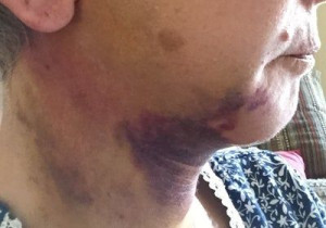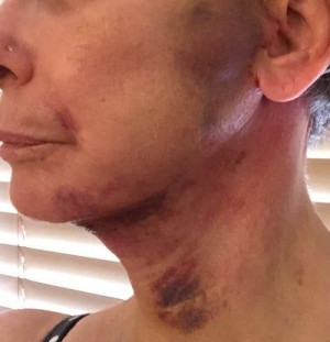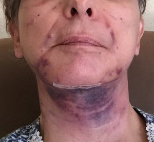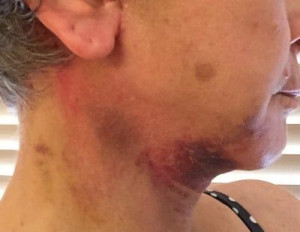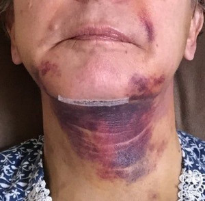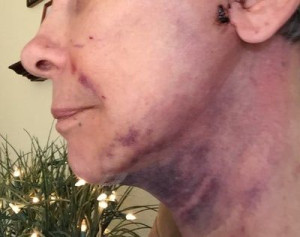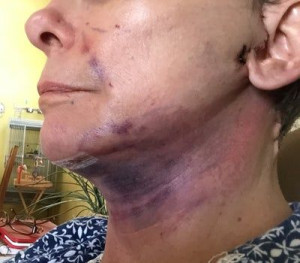 Sang đến ngày thứ 7 rồi mà mặt vẫn còn bị sưng còn cổ thì vẫn bầm tím khủng khiếp. Xem ảnh hôm qua là mọi người có thể thấy vết bầm sẫm và rộng như thế nào. Tôi thấy nhiều người sau khi căng da mặt đến ngày thứ 5, 6, 7 hoặc 9 là đã không còn thấy bị bầm tím và chỉ sưng rất nhẹ, đúng là khó tin thật.