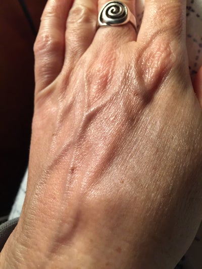 Từ ảnh của bạn thì có thể thấy bàn tay của bạn đã bị lão hóa da và mất mô mềm (khiến da mu bàn tay trông có vẻ mỏng đi và lộ tĩnh mạch). Bạn sẽ cần một phương pháp điều trị kết hợp tái tạo bề mặt da (peel da hóa học, điều trị bằng laser thẩm mỹ hoặc sản phẩm dạng bôi) với một phương pháp để làm đầy cho mu bàn tay như cấy mỡ tự thân hay tiêm chất làm đầy để cải thiện tổng thể mu bàn tay, che đi các tĩnh mạch và làm cho bàn tay trông đầy đặn hơn. Ngoài ra, mỗi ngày đều phải bôi kem chống nắng lên bàn tay để ngăn chặn tác hại của ánh nắng mặt trời. Không có cách nào để loại bỏ các đường tĩnh mạch cả.