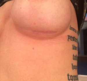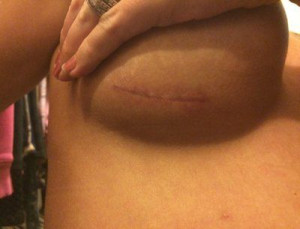 Bác sĩ nói rằng bây giờ có thể mặc áo ngực có gọng rồi, nhưng mình vẫn chưa mặc. Mình có vài cái cỡ 32D nhưng có lẽ bây giờ cũng quá nhỏ, cần phải tăng lên một cỡ, nhưng mình vẫn đang chờ một thời gian nữa mới mua thêm áo ngực. Hôm qua mình mới bắt đầu dán miếng silicon lên vết sẹo, hi vọng sẽ có hiệu quả, nếu không thì dù sao cũng đáng thử mà hihi.