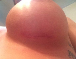 Mình nghĩ là bình thường sức khỏe mình khá tốt. Mình đã sinh 2 đứa con nhưng đây thực sự là lần bị đau nhất từ trước tới giờ. Mình đã uống 2 viên Vicodin,1 viên Valium và cứ cách 20 phút lại chườm đá vùng ngực một lần trong 20 phút. Tới giờ vẫn chưa thấy xuất hiện vết bầm nào. Mình thực sự thích bác sĩ. Mình nghĩ ông ấy đã làm tốt lắm rồi nên cũng chẳng mong có được kết quả tốt hơn vậy nữa đâu. À mà nếu mấy bạn thấy lo lắng về việc gây mê tĩnh mạch với gây mê toàn thân thì đúng là đang lo lắng vô ích rồi nhé. Mình đã gây mê tĩnh mạch nè và kết quả là chẳng nhớ gì về ca phẫu thuật hết hehe. Mình có đăng vài bức ảnh cập nhật tình hình ngực vào ngày thứ 3 đấy, mọi người xem nhé.