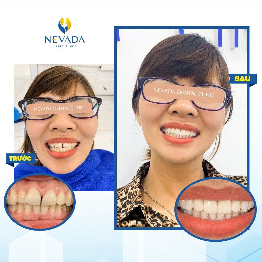 Tình trạng: Răng cửa có khe thưa lớn, răng ngả màu, răng cửa giữa bên phải hàm trên nằm chen chúc lên răng cửa giữa.
