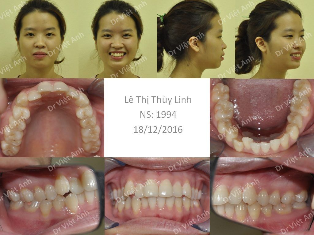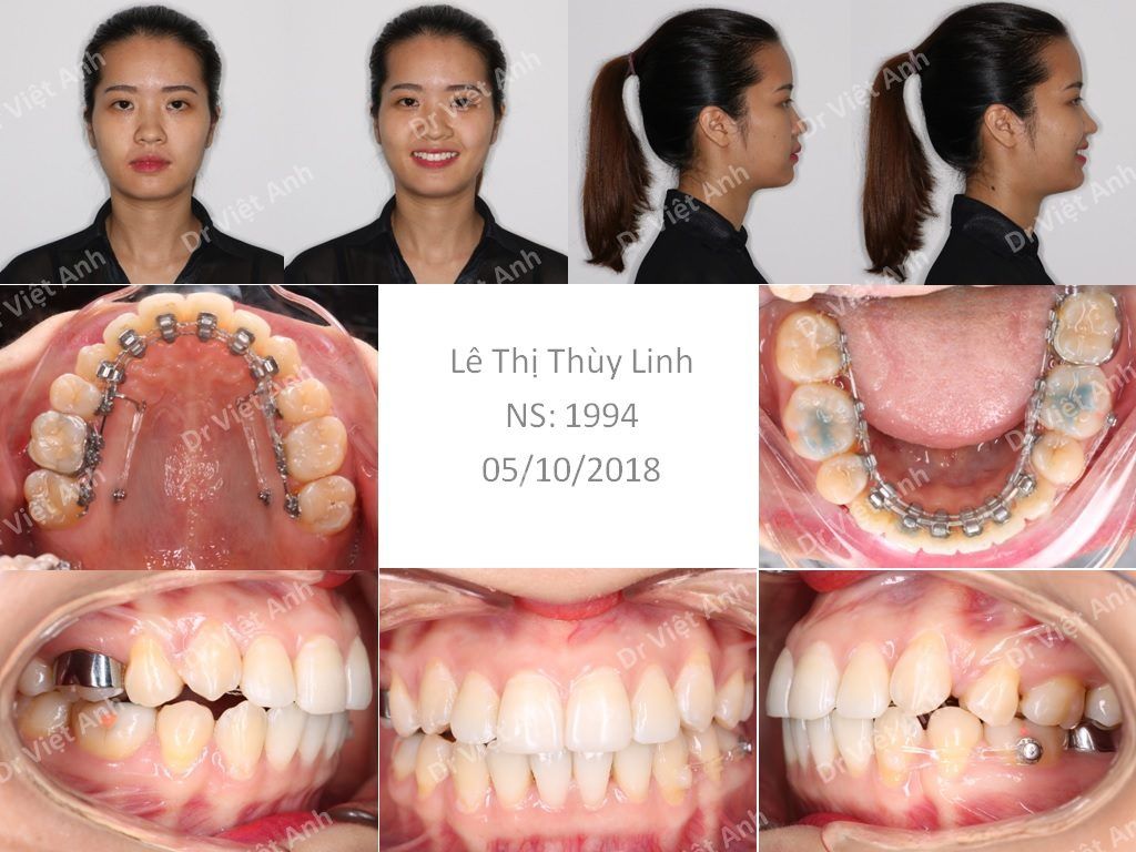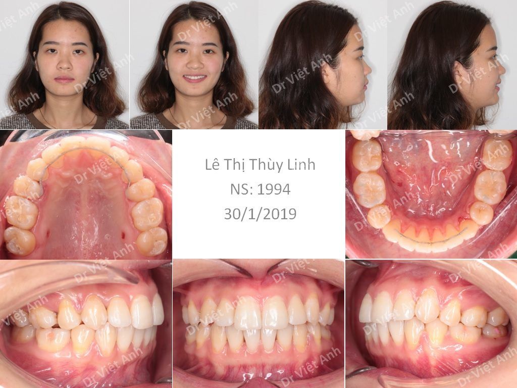 Sau 2 năm niềng răng mặt trong bằng mắc cài mặt lưỡi CLB, các răng đã được sắp xếp đều đặn, thẳng hàng. Khoảng trống nhổ răng được kéo khít hoàn toàn, không bị hở. Răng cửa từ tình trạng bị chìa ban đầu đã được kéo dựng thẳng mà không bị quặp vào trong. Thẩm mỹ nụ cười tuyệt vời do cung răng rộng ra ở hai bên. Khớp cắn lồng múi rất chuẩn. Thẩm mỹ khuôn mặt trở nên rất hài hòa do môi đã được kéo lui, môi có thể ngậm kín, rãnh môi cằm trở nên rõ hơn.