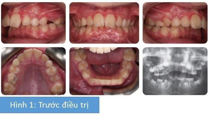 Bệnh nhân hiện đang ở giai đoạn sớm của bộ răng vĩnh viễn. Ở cung hàm trên, R23, R13, R14 và R15 đều mọc được 1 phần. Độ cắn chìa và cắn trùm đã giảm. Cung hàm trên dược nong rộng nhờ khí cụ chức năng. Có cắn hở ở phía bên nhiều. Vệ sinh răng miệng kém.