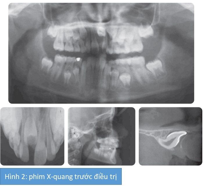 Tất cả các răng đều xuất hiện, gồm cả R21 và các răng hàm lớn thứ 3. R21 nằm theo hướng ngang và chân răng phát triển hoàn toàn. Không có dấu hiệu bệnh lý. Phim chụp cắt lớp vi tín với chùm tia hình nón (CBCT) xác nhận răng R21 bị lệch nhưng có tiên lượng kéo lên tốt.
