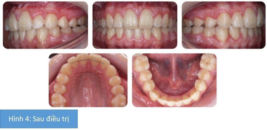 Từ hình 1 cho thấy: Tương quan răng cửa hạng I (xương hàm dưới ở tư thế ra trước trong ảnh chụp) với độ cắn chìa bình thường và độ cắn trùm giảm nhưng khép kín. Đường giữa hàm trên lệch trái 2 mm và tương quan răng hàm lớn là hạng II ½ núm bên phải và hạng II toàn bộ núm bên trái. Có cắn chéo răng sau 2 bên.