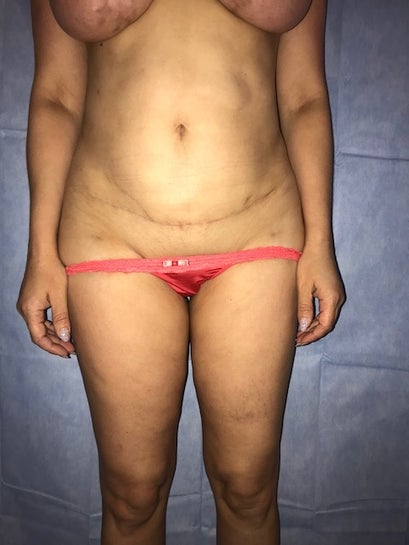 Tôi cảm thấy bụng lúc 2 tuần sau phẫu thuật trông còn ổn hơn hiện tại sau 1,5 tháng. Vùng mép quần sưng lệch sang một bên, lồi ra, bụng thì trông như mang thai 5 tháng. Chuyện gì đang xảy ra thế này? Các bác sĩ phẫu thuật thẩm mỹ đều bảo là do sưng nề, nhưng càng chờ thì nó chỉ càng tệ hơn chứ không thấy khá lên chút nào. Tôi sợ mình vừa đốt tiền mà chẳng được gì! Tôi đã làm tạo hình thành bụng toàn phần, kèm thắt chặt cơ bụng và hút mỡ ụ hông, má đùi ngoài, cũng như treo ngực sa trễ bằng đường rạch hình kẹo mút có đặt túi độn ngực. Đùi của tôi trông vẫn y như trước.
