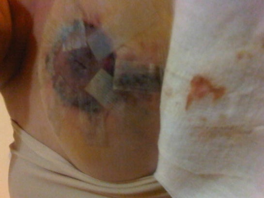 Bác sĩ phẫu thuật của bạn là người duy nhất đã khám kỹ lưỡng cho bạn và tôi muốn tin tưởng bác sĩ ấy, nhưng nhìn vào bức ảnh bên trái và giữa ngực, bạn có vẻ bị hoại tử gần như toàn phần ở phức hợp quầng vú/núm vú, kèm theo việc nửa trên của vết rạch dọc sắp sửa tách rời. Đây là một biến chứng được biết đến của những ca thu nhỏ ngực rất lớn, đặc biệt là với khoảng cách trước phẫu thuật giữa núm vú và khuyết cảnh xương ức (chỗ lõm xương ở đáy cổ). Điều này dễ xảy ra hơn nếu ca phẫu thuật được thực hiện ở những người hút thuốc (chủ động hoặc thụ động, hoặc phụ nữ mắc bệnh tiểu đường hoặc một số bệnh miễn dịch). Tại thời điểm này, trừ khi tình trạng nhiễm trùng tăng lên, hầu hết các bác sĩ phẫu thuật sẽ điều trị cho bạn bằng thuốc mỡ kháng khuẩn (chẳng hạn như Silvandene hoặc những loại khác) và đợi mô sống tự tách ra khỏi mô chết. Một khi quá trình này hoàn tất, bạn sẽ cần một hoặc nhiều ca phẫu thuật nhỏ để loại bỏ phần thịt chết và vết thương sau đó sẽ tự lành. Có thể cần ghép da để tạo lại phức hợp núm vú. Bác sĩ phẫu thuật của bạn có thể đang cố che chắn bạn khỏi những sự thật này. Bạn nên tiếp cận tình huống này một cách bình tĩnh và cố gắng tìm ra cách để bạn và bác sĩ có thể làm việc cùng nhau để giải quyết vấn đề này. Vấn đề này hoàn toàn có thể giải quyết được vì vậy đừng tuyệt vọng.