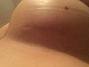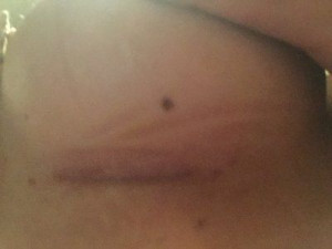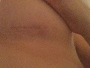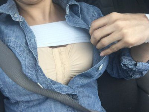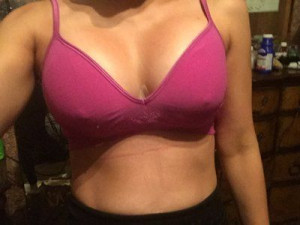 Quá trình hồi phục của mình đã thật hoàn hảo cho đến hôm qua mình phát hiện ra phía bên ngực trái chỗ dải áo ngực đè lên để giúp nó hạ xuống đang chuyển sang màu hồng tím. Mình sẽ gọi cho bác sĩ hỏi xem sao, nhưng có cảm giác chiếc áo ngực phậu thuật này đang khiến nó trở nên tệ hơn. Để bình thường không mặc gì thì nó không đau, mà chỉ có màu đỏ tím như trong hình thôi. Nhưng nếu mình cài dải áo ngực vào thì rất đau, kiểu đau nhói nhói ấy, vì vậy mình sẽ không mặc nó nữa. Giá mà có thể đến kiểm tra với bác sĩ nay trong ngày hôm nay. Chỉ muốn có thể mặc một chiếc áo ngực thể thao bình thường thôi.