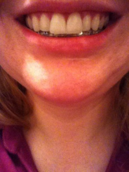 Bác sĩ thực hiện trên hàm trên trước, lắp mắc cài lên từng răng một (nhưng để lại một chiếc không lắp vì bác sĩ nói là không cần). Sau khi hoàn thành ở hàm trên thì bác sĩ dừng lại 5 phút. Trong lúc đấy thì mình có chụp lại một bức ảnh hàm trên khi đã lắp mắc cài và sau đó kiểm tra vết giộp nhưng lúc này mình chỉ cảm thấy đau chứ chẳng kịp xem nó ra làm sao. Mình có bôi Vaseline lên vết giộp nhưng chẳng biết là có tác dụng gì hay không.