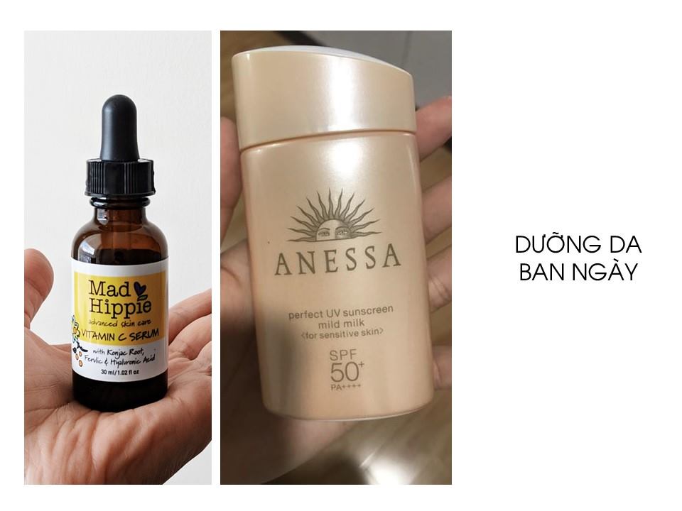 Do đã dùng acid latic ban đêm nên em dùng serum vitamin C Mad Hippie vào buổi sáng + kem chống nắng của Anessa.