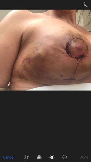 Hình ảnh và các triệu chứng của bạn cho thấy có một khối máu đông bên dưới da và đang chèn ép lên núm vú. Bạn nên hỏi bác sĩ phẫu thuật của mình xem liệu sục rửa máu đông ra ngoài có giúp gì hay không.