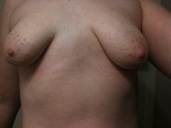 Bạn đã xác định chính xác mình là người có bộ ngực hình ống - quầng vú to, xệ, nếp gấp dưới bầu ngực nằm ở vị trí cao và hai bầu ngực cách xa nhau. Tôi nghĩ rằng bạn sẽ có được kết quả tốt nhất khi nâng ngực, sắp xếp lại mô vú cùng lúc (tôi mở rộng bầu ngực dưới để nó đồng đều hơn trên thành ngực) và treo sa trễ bằng đường rạch quanh quầng vú. Nếu chỉ cấy mỡ thì quầng vú vẫn to và bầu ngực không thay đổi hoàn toàn về hình dáng. Ngực sẽ đẹp hơn chút, đặc biệt nếu làm treo sa trễ, nhưng không phải đẹp nhất. Cũng có một số vấn đề đối với việc cấy mỡ khi sắp xếp lại/nâng mô vú - về cơ bản bác sĩ phẫu thuật chỉ có thể cấy mỡ vào mô KHÔNG được di chuyển tại thời điểm phẫu thuật. Là một bác sĩ phẫu thuật, việc bạn tự bóc da khiến tôi lo lắng - tại sao bạn lại làm như vậy? Nếu bạn là bệnh nhân của tôi, tôi sẽ hét vào mặt bạn. Đừng cố bóc da vết mổ của bạn sau khi phẫu thuật. Đừng bao giờ bóc bất cứ thứ gì trừ khi bạn vừa rửa tay sạch sẽ, điều đó sẽ khiến bạn ít nhất không phải lơ đãng cậy, bóc da cả ngày. Hãy thử công nghệ ánh sáng IPL (thường được gọi là "fotofacial") để loại bỏ vùng biến dạng sắc tố, một phương pháp điều trị Cosmelan hoặc hydroquinone tại chỗ để làm sáng hoặc loại bỏ các đốm. Nhớ đừng cậy da nữa nhé.