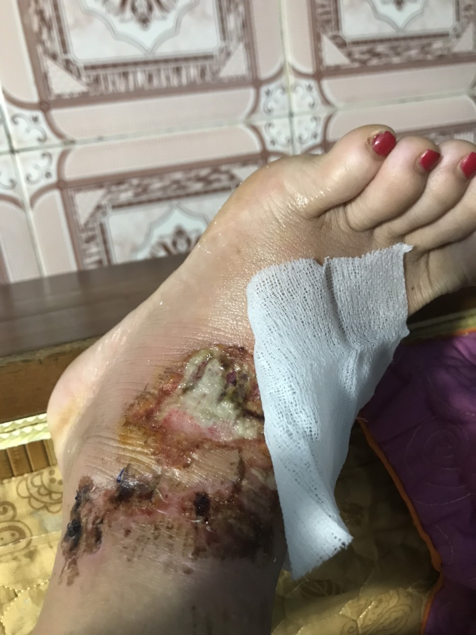 Vợ em bị tai nạn vết thương đang hiện màu trắng có phải là mũ không ạ.