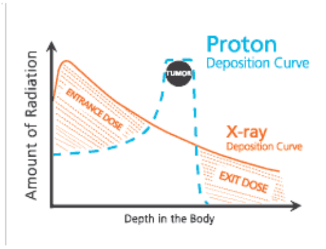 - Xạ trị proton (đường xanh nét đứt): Liều lượng bức xạ đạt mức tối đa khi đến khối u (điều chỉnh theo mức năng lượng), liều bức xạ trước khối u rất thấp và liều bức xạ sau khối u hầu như không có, do vậy rất ít biến chứng do xạ trị.