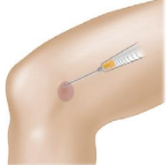 - Tiến hành tiêm khớp : Vị trí tiêm cạnh lồi cầu, hướng kim về phía lồi cầu, tạo với mặt da 1 góc khoảng 45 – 60 độ, đâm kim sâu 5mm, rút nhẹ pitton kiểm tra không có máu, đẩy pitton thấy nhẹ tay. Liều lượng thuốc: 0.3-0.5 ml